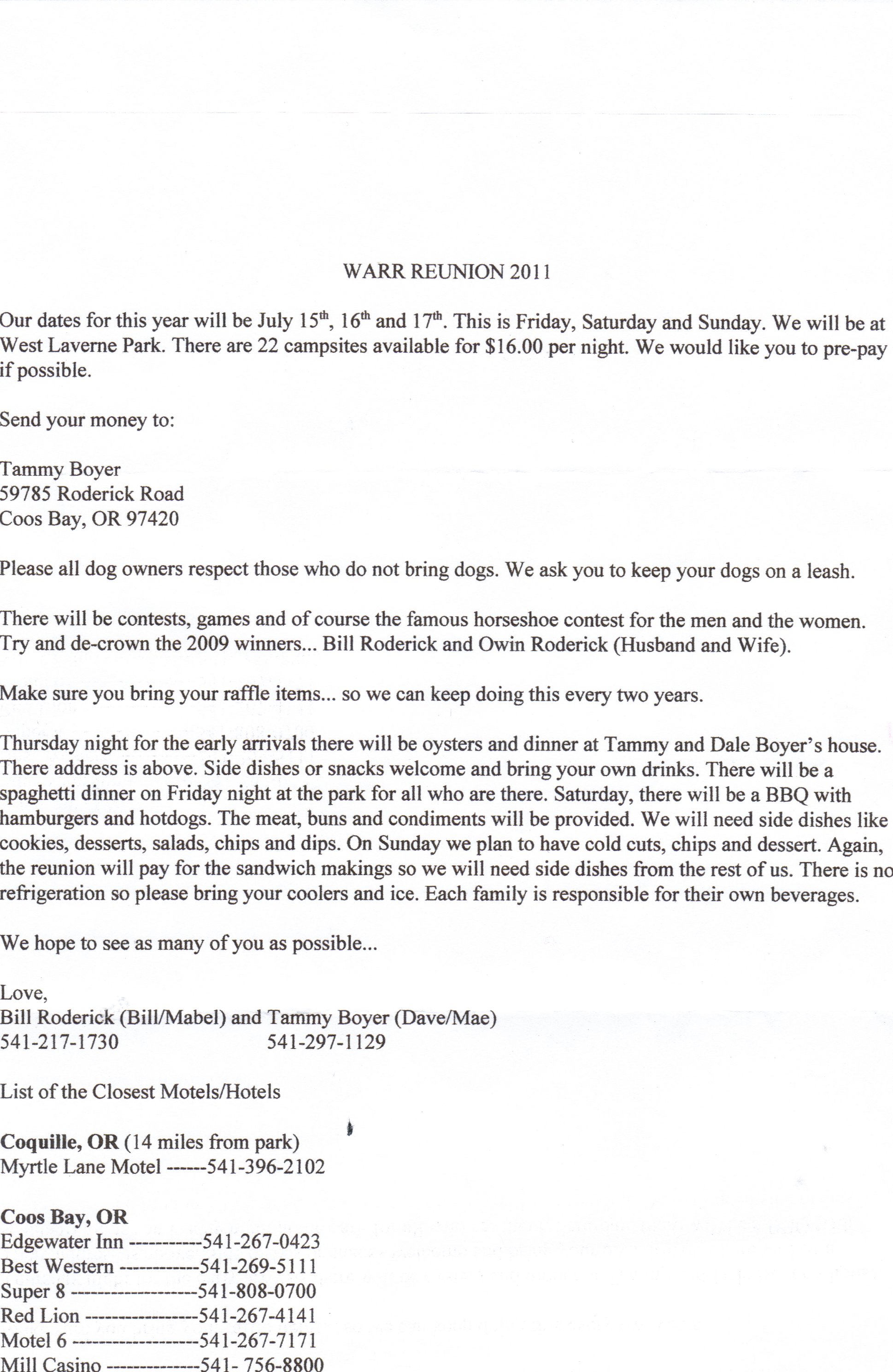WARR FAMILY REUNION is set for JULY 15 AND 16, 2011...